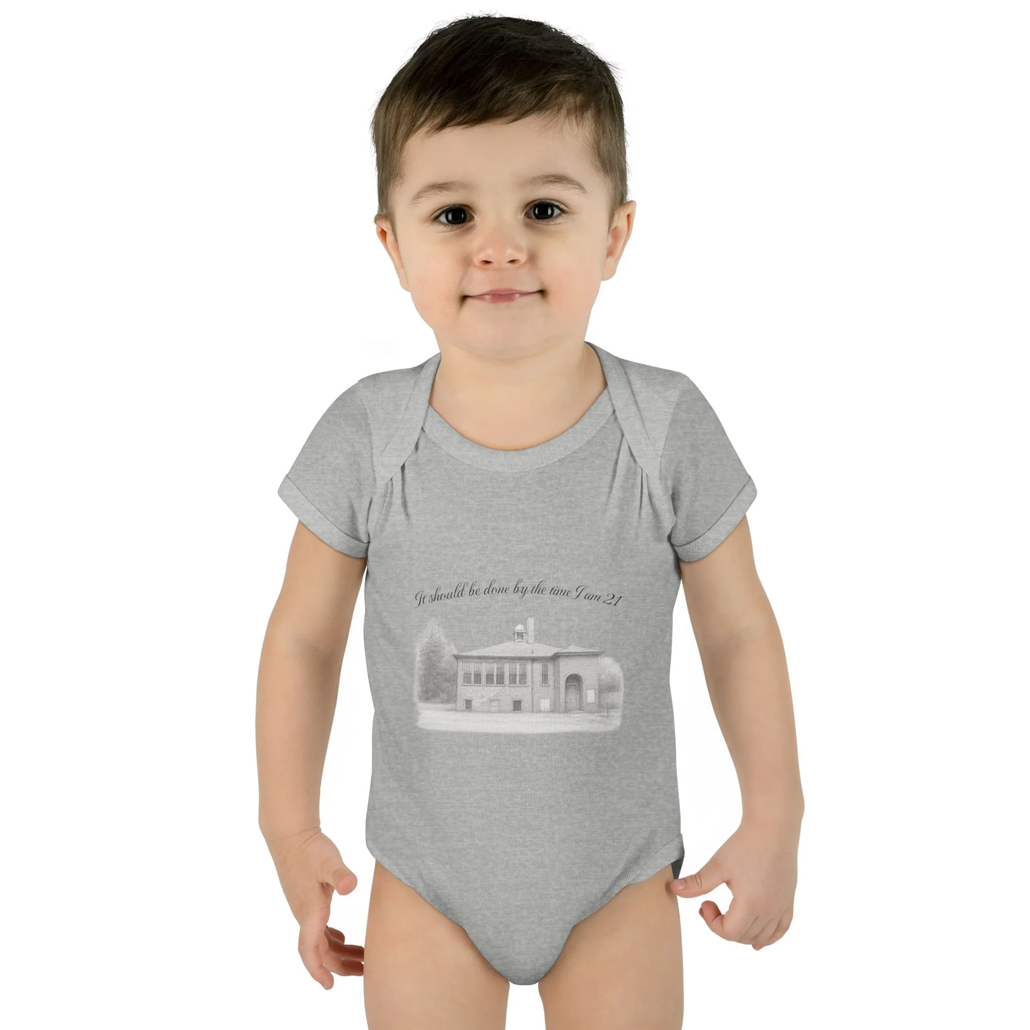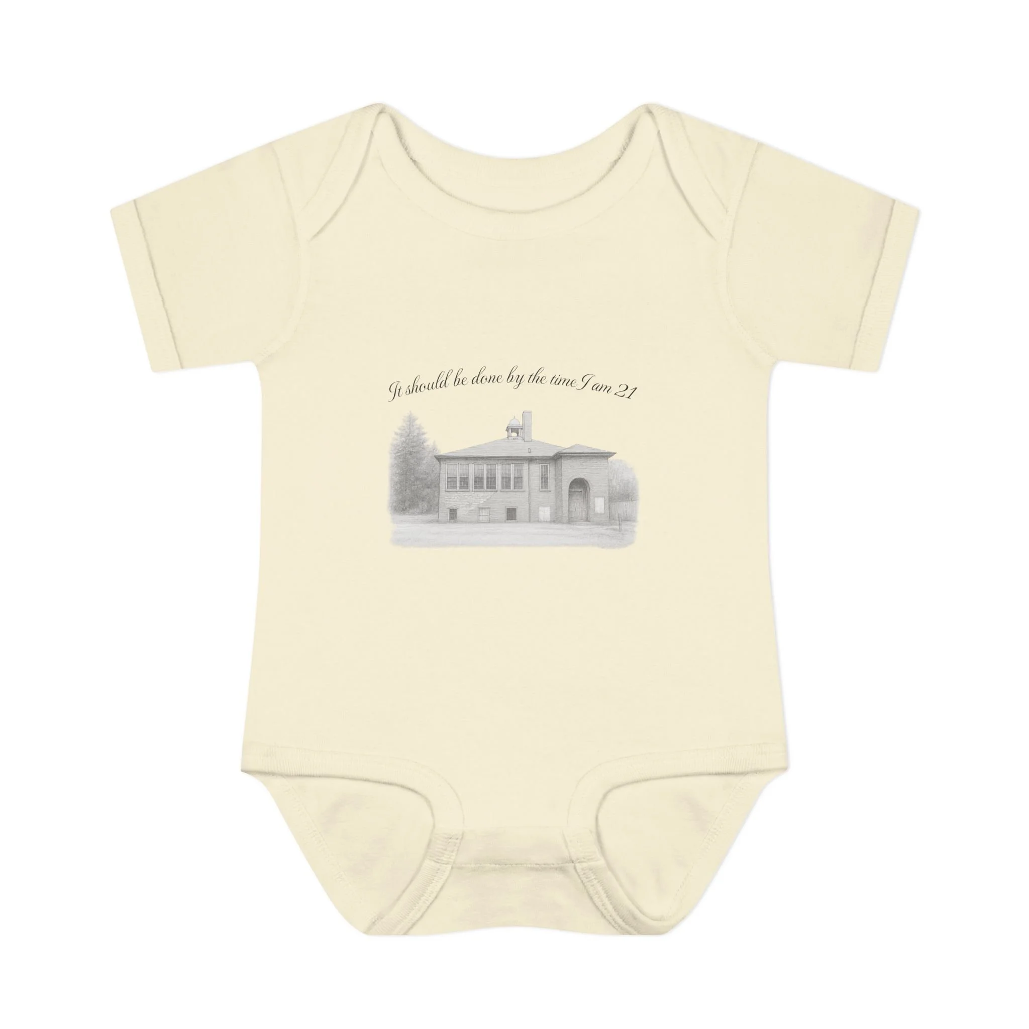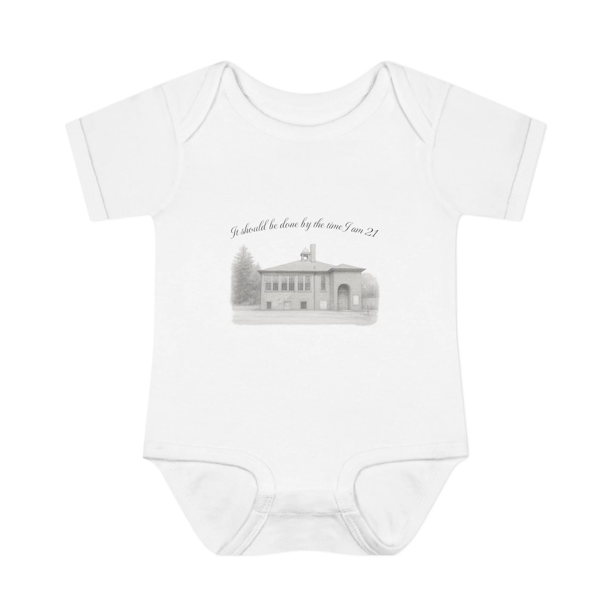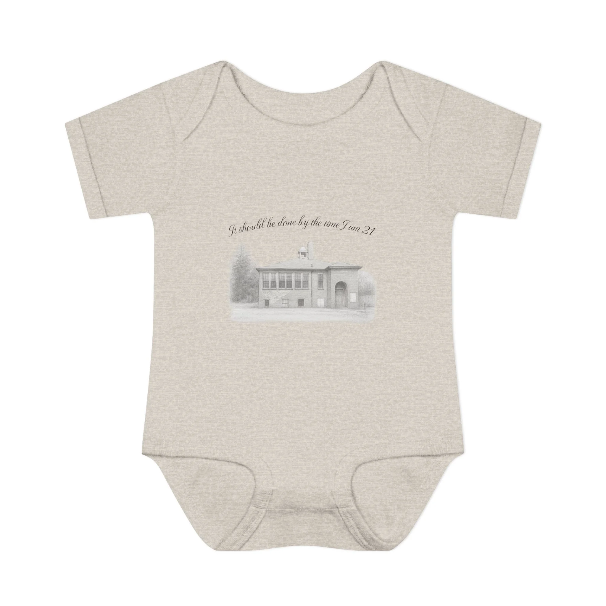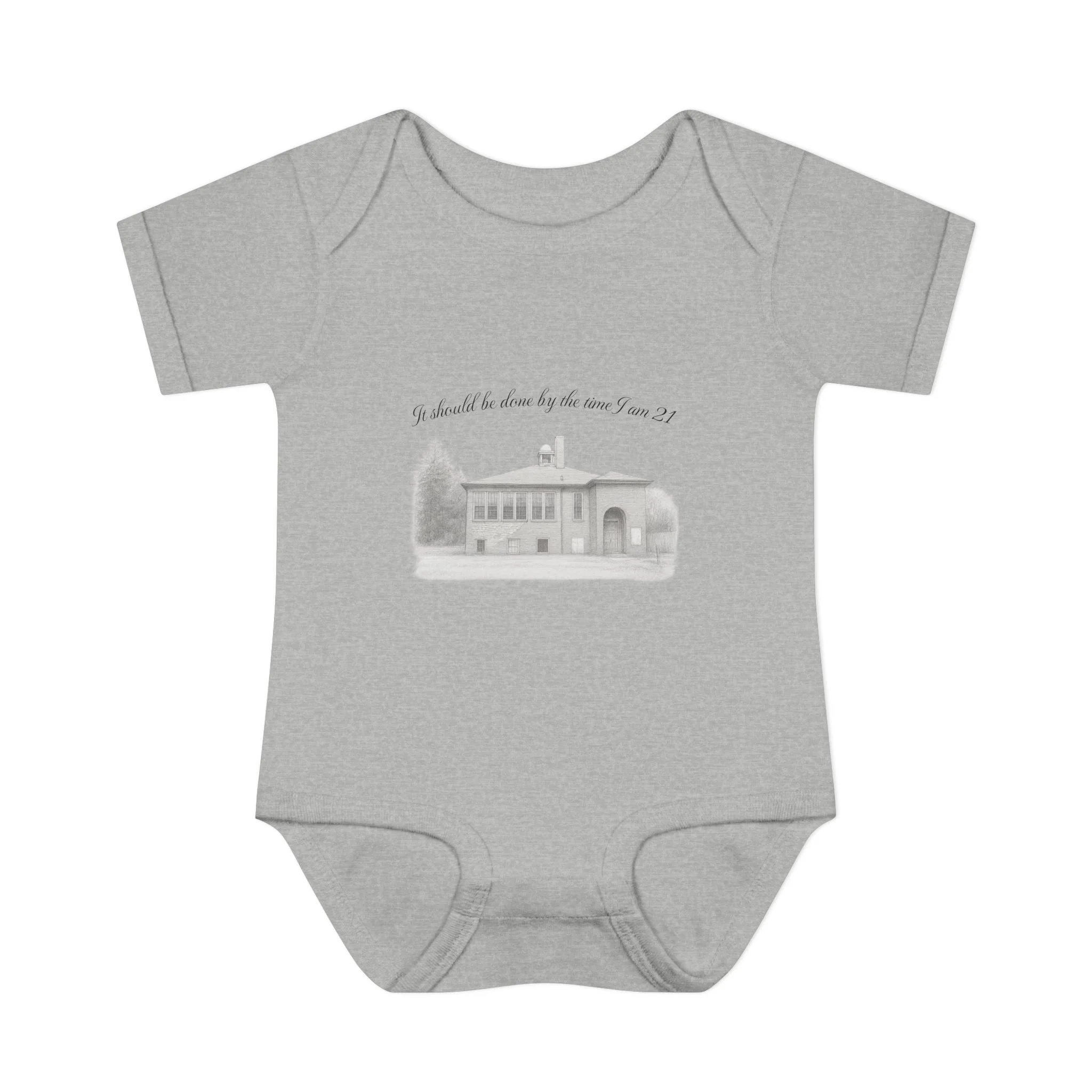 A soft, lightweight infant bodysuit featuring a pencil sketch of the former Fremont School and a gentle handwritten phrase above it. The subtle grayscale print sits on breathable combed ringspun cotton that keeps baby comfortable through naps and play. Thoughtfully designed with lap shoulders and a three-snap closure, dressing and diaper changes are quick and fuss-free. The ribbed edges and reinforced seams keep the silhouette neat wash after wash, while the tear-away label and smooth DTF neck print ensure no scratchy tags against tender skin. This piece layers easily under sweaters or pairs with tiny leggings for a calm, cozy look that feels like home.